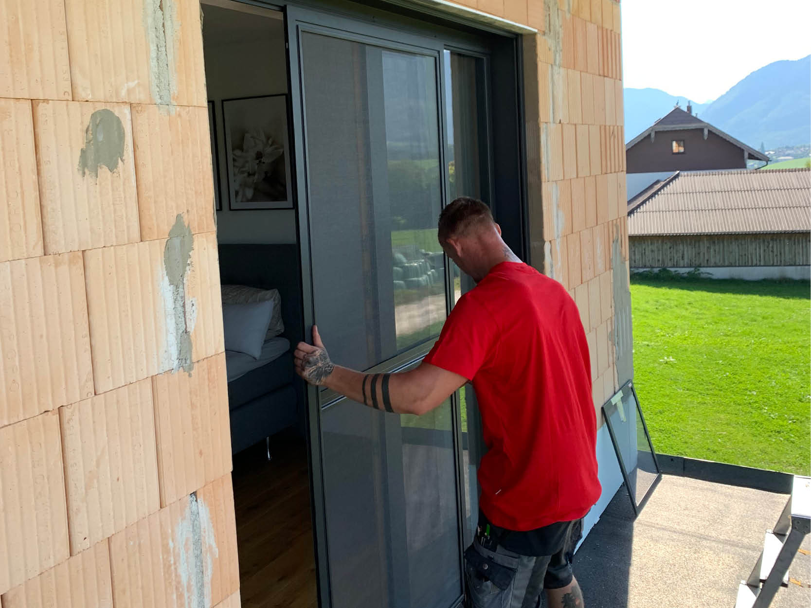 Verbaute Produkte: Thermoton Ziegel-Rollladenkasten Mauerstärke 50 cm | Raffstore gebördelte Lamellen 80 mm 7016 anthrazitgrau | Rollladen Alu ausgeschäumt M521 anthrazitgrau | Insektengitter Schiebeelemente, Drehtür selbstschließend und Spannrahmen